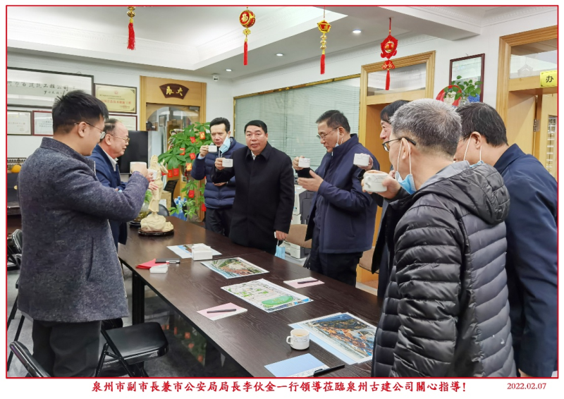 2月7日,正月初七,泉州市副市長(zhǎng)、市公安局局長(zhǎng)李伙金一行領(lǐng)導(dǎo)蒞臨泉州古建公司團(tuán)拜走訪,董事長(zhǎng)蔣欽全、總經(jīng)理蔣無(wú)盡熱情接待。