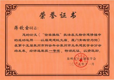 我司蔣欽全董事長論文《“偷梁換柱”技法在文物古建修繕中的成功運(yùn)用—以福建建甌文廟、廈門青礁宮為例》在第十五屆泉州市科協(xié)年會(huì)泉州市土木建筑學(xué)會(huì)分會(huì)場發(fā)表,經(jīng)評(píng)榮獲一…