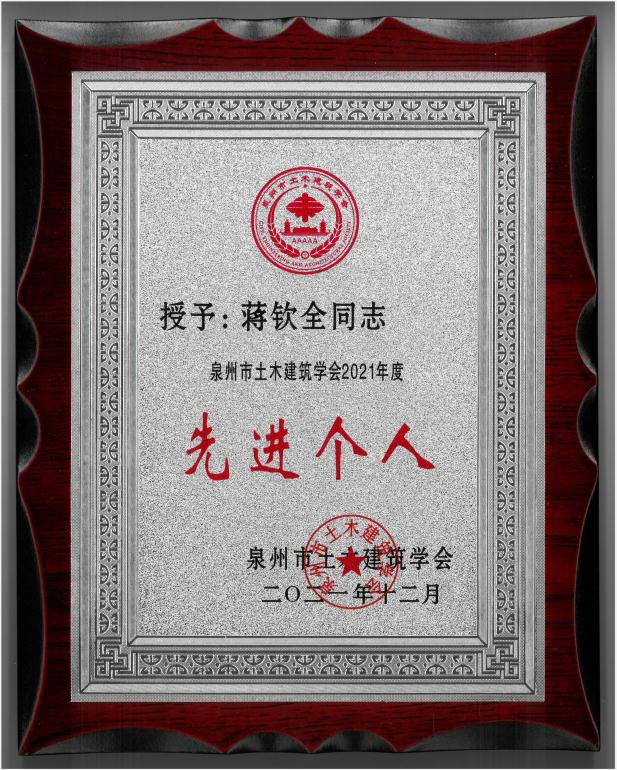董事長蔣欽全榮獲泉州市土木建筑學(xué)會2021年度先進(jìn)個人