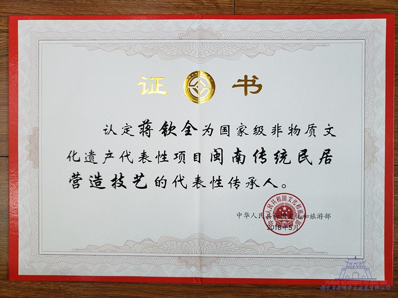 6月9日,由省文化廳主辦的“文化和自然遺產(chǎn)日”福建系列活動啟動儀式在福建博物院舉行,董事長蔣欽全獲頒第五批國家級非遺傳承人證書。
