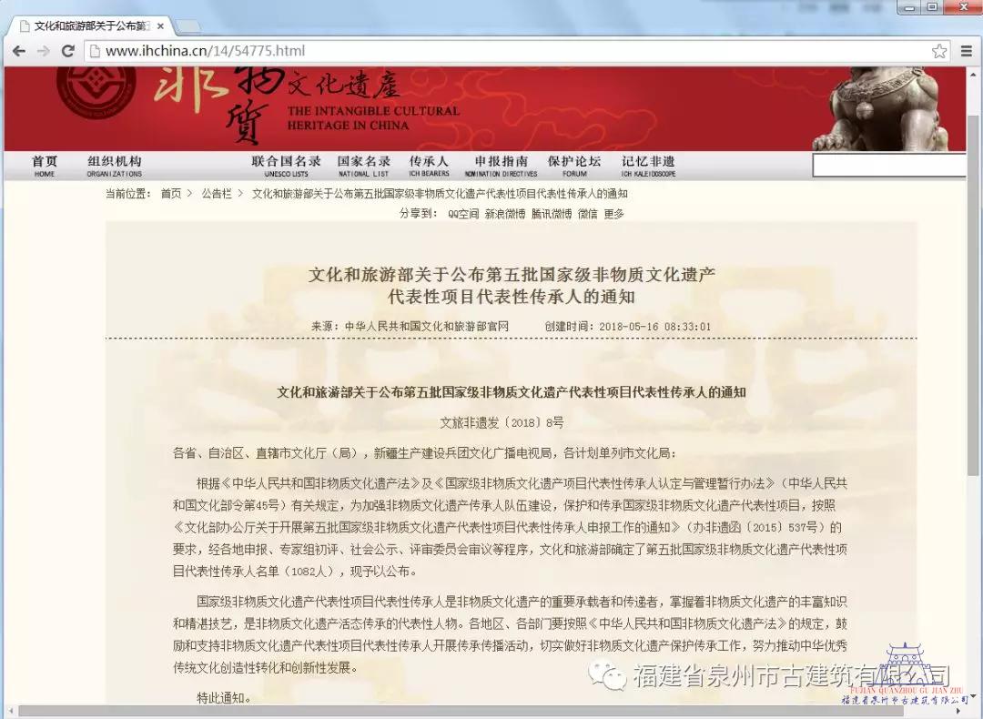 2018年5月16日,國家文化和旅游部公布了第五批國家級非物質(zhì)文化遺產(chǎn)傳承人名單,我司董事長蔣欽全獲評“閩南傳統(tǒng)民居營造技藝”非遺傳承人。