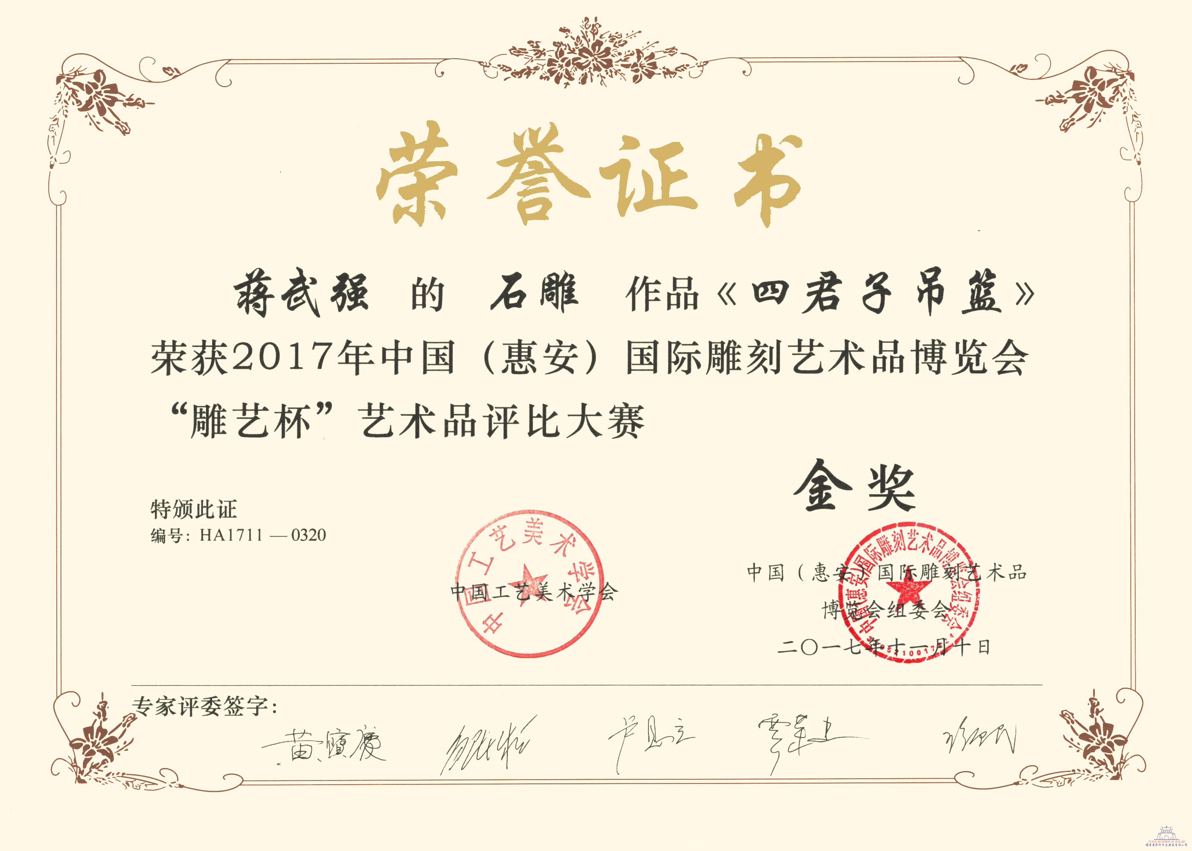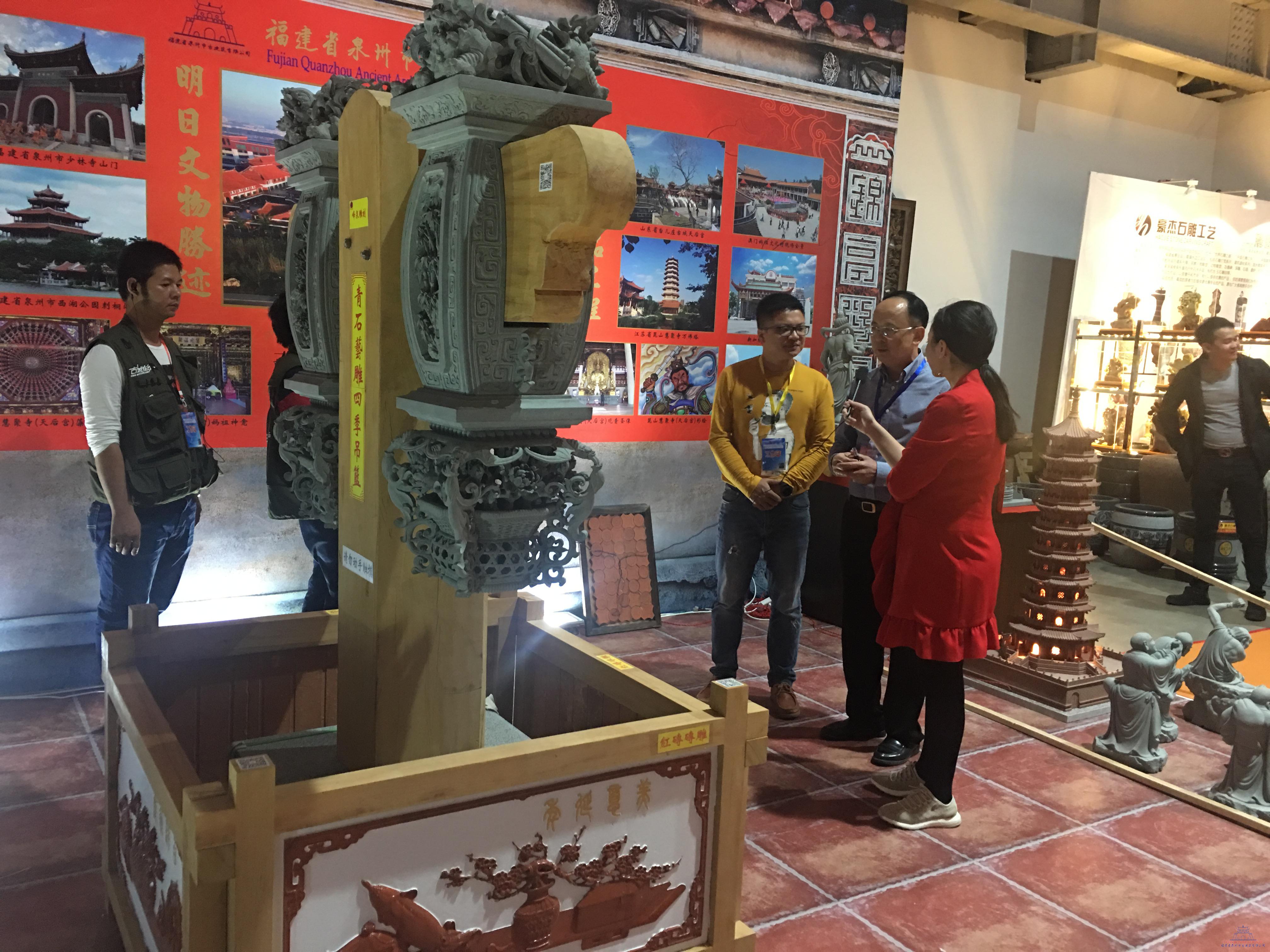 現(xiàn)場門庭若市,四君子吊籃雕工細(xì)致,藻井(蜘蛛結(jié)網(wǎng))富麗堂皇,吸引了眾多客商的眼球,成為本屆展會(huì)的一大亮點(diǎn),泉州古城在線等媒體紛紛前來采訪;且我司蔣武器石雕作品《四君子吊籃》榮獲2017年中國(惠安)國際雕刻藝術(shù)品博覽會(huì)“雕藝杯”藝術(shù)品評(píng)比金獎(jiǎng)。