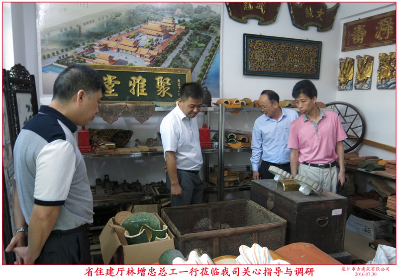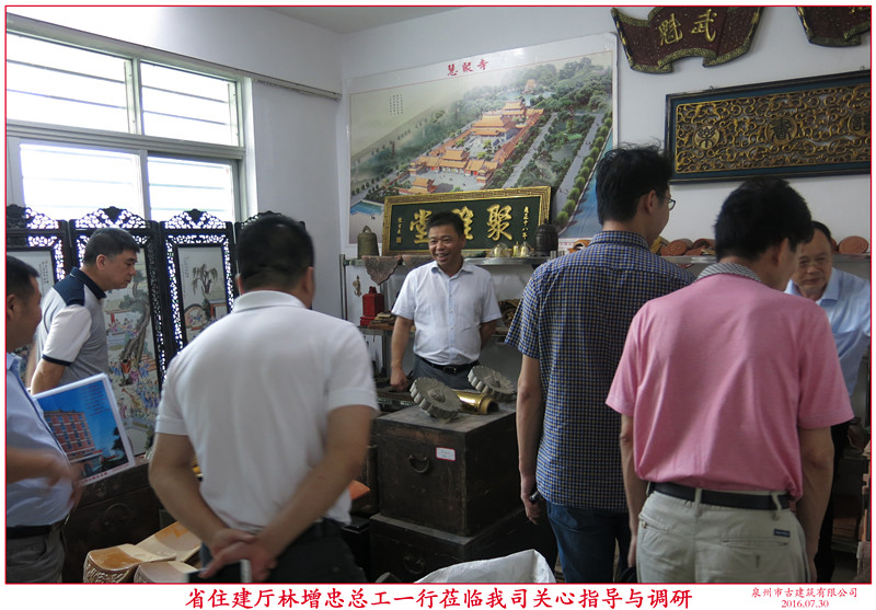 7月29日下午,福建省住建廳林增忠總工等一行蒞臨我司關心指導。首先,在公司董事長蔣欽全、副總李澤平的陪同下,參觀了辦公室及“泉州市閩南傳統(tǒng)民居營造技藝傳習所”展示廳。