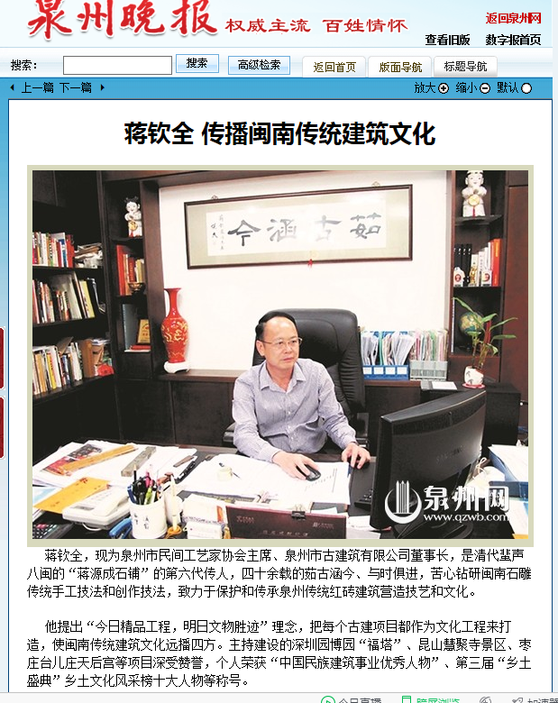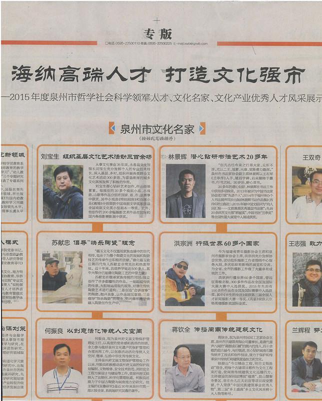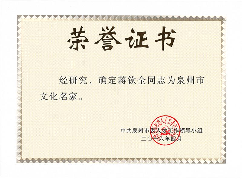 蔣欽全董事長(zhǎng)榮獲“2015年度泉州市十大文化名家”稱號(hào)