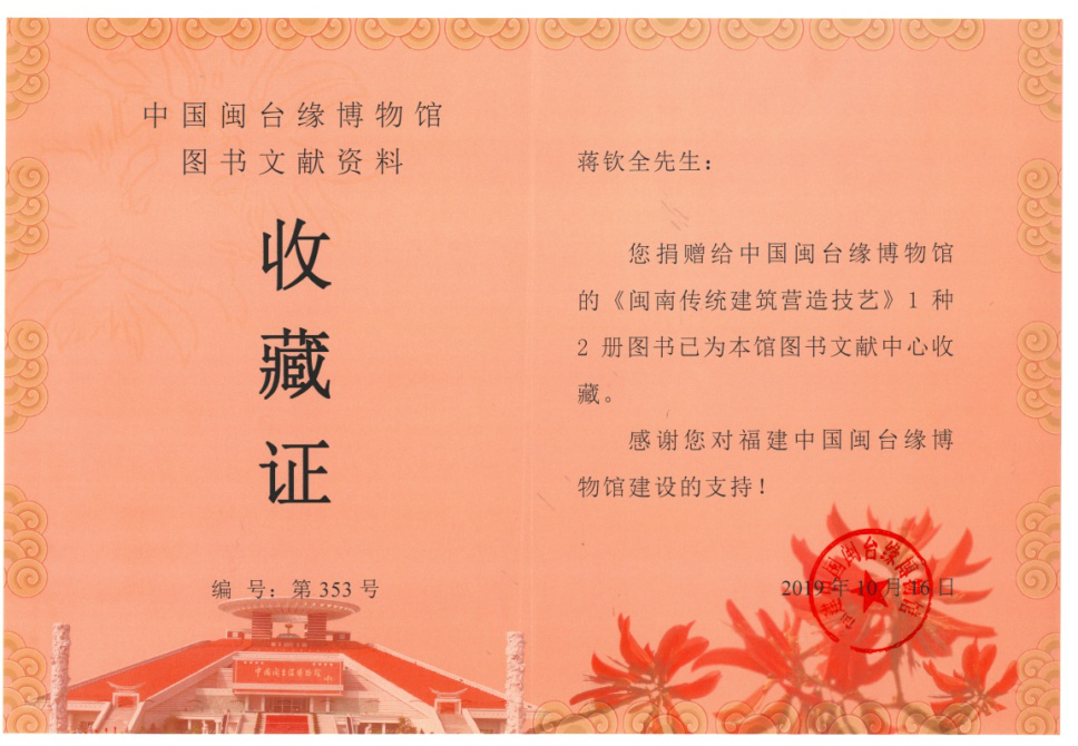 開幕儀式上,國家級閩南傳統(tǒng)民居營造技藝傳承人蔣欽全的專著《閩南傳統(tǒng)建筑營造技藝》被中國閩臺緣博物館圖書文獻(xiàn)中心收藏。