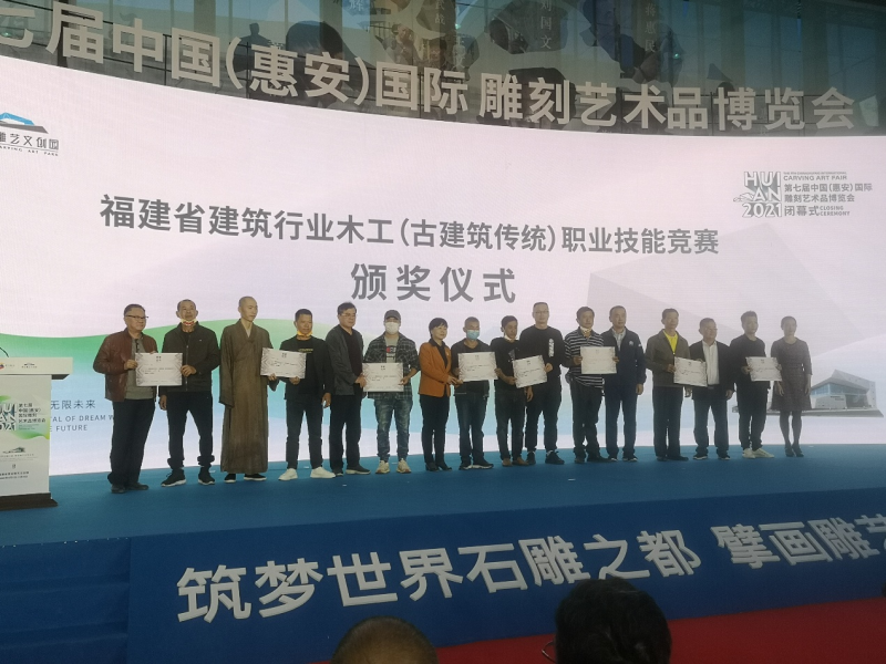 為弘揚(yáng)精益求精的工匠精神,推進(jìn)閩南古建筑營(yíng)造技藝的傳承發(fā)展。 2021年福建省建筑行業(yè)木工(古建筑傳統(tǒng))職業(yè)技能競(jìng)賽于2021年11月11日至14日,在惠安雕藝文創(chuàng)園舉辦。泉州古建筑公司選手張楊濤以其扎實(shí)的理論基礎(chǔ)及精湛的技藝榮獲競(jìng)賽一等獎(jiǎng),為公司摘得桂冠。