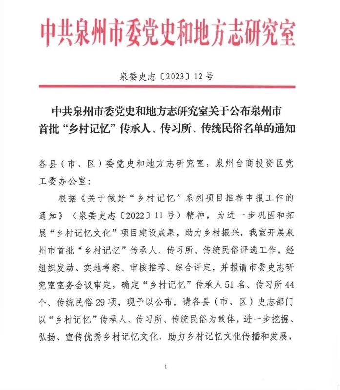 公布泉州市首批“鄉(xiāng)村記憶” 傳承人、傳習(xí)所、傳統(tǒng)民俗名單